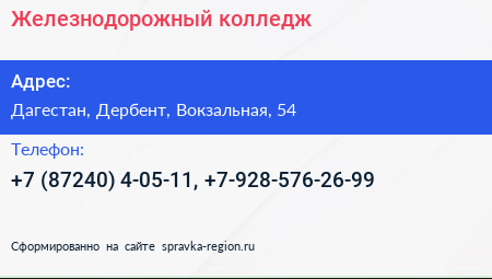 Железнодорожный колледж по адресу Дагестан, Дербент, Вокзальная, 54 в дальнейшем Организация, размещена в следующих категориях: