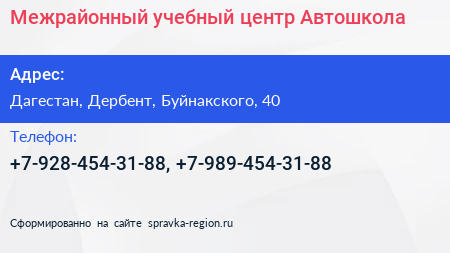 Межрайонный учебный центр, Автошкола по адресу Дагестан, Дербент, Буйнакского, 40 в дальнейшем Организация, размещена в следующих категориях: