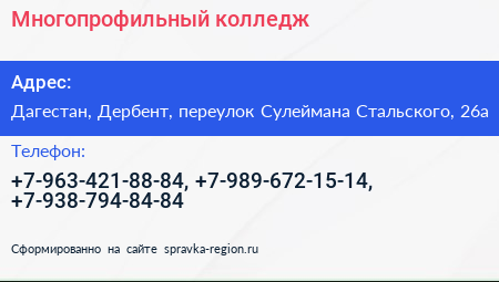 Многопрофильный колледж по адресу Дагестан, Дербент, переулок Сулеймана Стальского, 26а в дальнейшем Организация, размещена в следующих категориях: