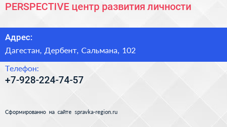 PERSPECTIVE, центр развития личности по адресу Дагестан, Дербент, Сальмана, 102 в дальнейшем Организация, размещена в следующих категориях: