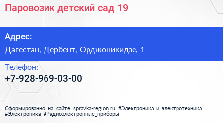 Паровозик, детский сад №19 по адресу Дагестан, Дербент, Орджоникидзе, 1 в дальнейшем Организация, размещена в следующих категориях:
