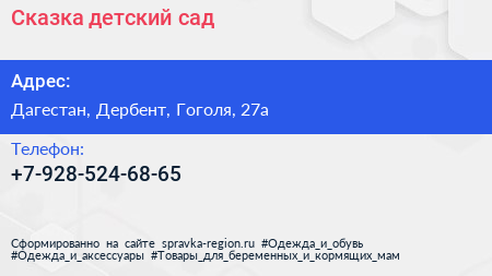 Сказка, детский сад по адресу Дагестан, Дербент, Гоголя, 27а в дальнейшем Организация, размещена в следующих категориях: