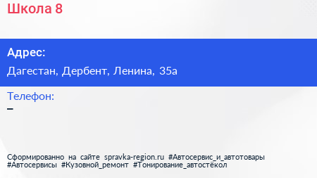 Школа №8 по адресу Дагестан, Дербент, Ленина, 35а в дальнейшем Организация, размещена в следующих категориях: