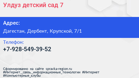 Улдуз, детский сад №7 по адресу Дагестан, Дербент, Крупской, 7/1 в дальнейшем Организация, размещена в следующих категориях: