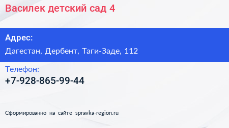 Василек, детский сад №4 по адресу Дагестан, Дербент, Таги-Заде, 112 в дальнейшем Организация, размещена в следующих категориях: