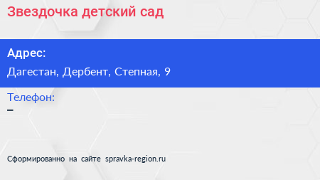 Звездочка, детский сад по адресу Дагестан, Дербент, Степная, 9 в дальнейшем Организация, размещена в следующих категориях: