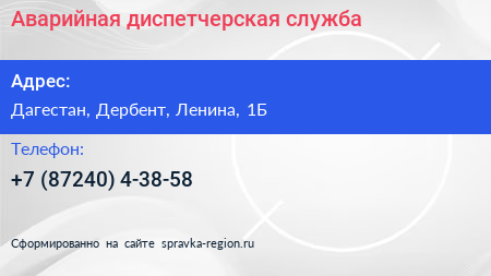 Аварийная диспетчерская служба по адресу Дагестан, Дербент, Ленина, 1Б в дальнейшем Организация, размещена в следующих категориях: