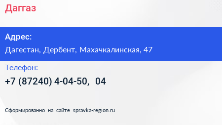Даггаз по адресу Дагестан, Дербент, Махачкалинская, 47 в дальнейшем Организация, размещена в следующих категориях: