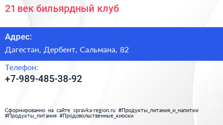 21 век, бильярдный клуб по адресу Дагестан, Дербент, Сальмана, 82 в дальнейшем Организация, размещена в следующих категориях: