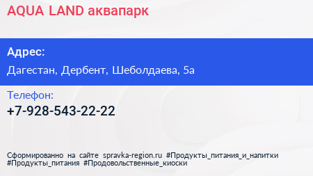 AQUA LAND, аквапарк по адресу Дагестан, Дербент, Шеболдаева, 5а в дальнейшем Организация, размещена в следующих категориях:
