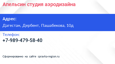 Апельсин, студия аэродизайна по адресу Дагестан, Дербент, Пашабекова, 10д в дальнейшем Организация, размещена в следующих категориях: