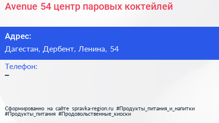 Avenue 54, центр паровых коктейлей по адресу Дагестан, Дербент, Ленина, 54 в дальнейшем Организация, размещена в следующих категориях: