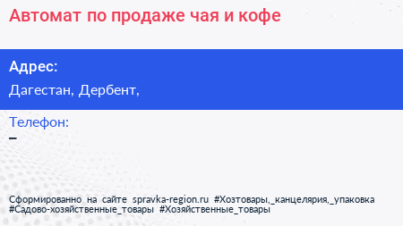 Автомат по продаже чая и кофе по адресу Дагестан, Дербент, в дальнейшем Организация, размещена в следующих категориях: