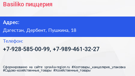 Basiliko, пиццерия по адресу Дагестан, Дербент, Пушкина, 18 в дальнейшем Организация, размещена в следующих категориях: