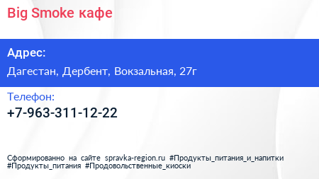 Big Smoke, кафе по адресу Дагестан, Дербент, Вокзальная, 27г в дальнейшем Организация, размещена в следующих категориях: