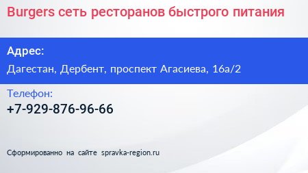 Burgers, сеть ресторанов быстрого питания по адресу Дагестан, Дербент, проспект Агасиева, 16а/2 в дальнейшем Организация, размещена в следующих категориях: