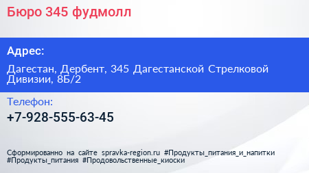 Бюро 345, фудмолл по адресу Дагестан, Дербент, 345 Дагестанской Стрелковой Дивизии, 8Б/2 в дальнейшем Организация, размещена в следующих категориях: