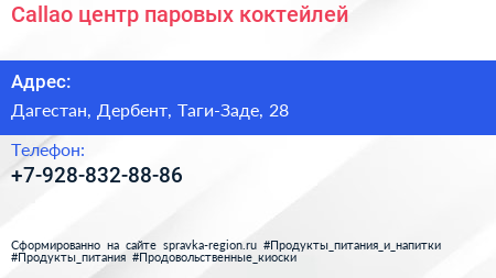 Callao, центр паровых коктейлей по адресу Дагестан, Дербент, Таги-Заде, 28 в дальнейшем Организация, размещена в следующих категориях: