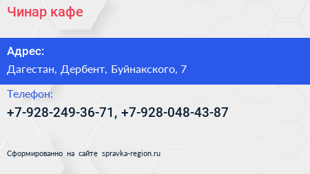Чинар, кафе по адресу Дагестан, Дербент, Буйнакского, 7 в дальнейшем Организация, размещена в следующих категориях:
