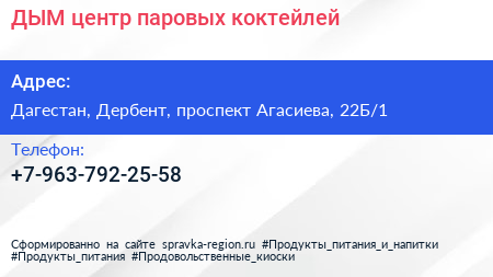 ДЫМ, центр паровых коктейлей по адресу Дагестан, Дербент, проспект Агасиева, 22Б/1 в дальнейшем Организация, размещена в следующих категориях: