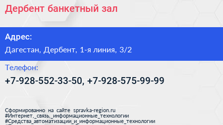 Дербент, банкетный зал по адресу Дагестан, Дербент, 1-я линия, 3/2 в дальнейшем Организация, размещена в следующих категориях: