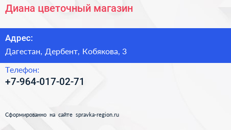 Диана, цветочный магазин по адресу Дагестан, Дербент, Кобякова, 3 в дальнейшем Организация, размещена в следующих категориях:
