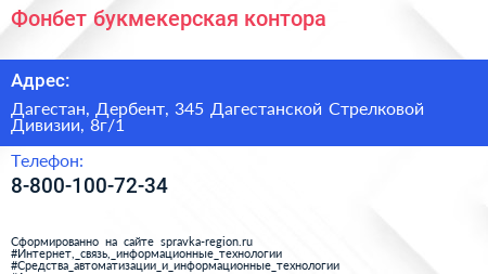 Фонбет, букмекерская контора по адресу Дагестан, Дербент, 345 Дагестанской Стрелковой Дивизии, 8г/1 в дальнейшем Организация, размещена в следующих категориях: