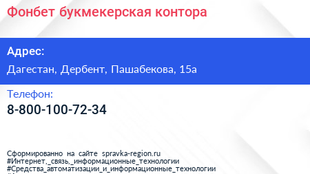 Фонбет, букмекерская контора по адресу Дагестан, Дербент, Пашабекова, 15а в дальнейшем Организация, размещена в следующих категориях: