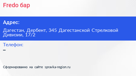 Fredo, бар по адресу Дагестан, Дербент, 345 Дагестанской Стрелковой Дивизии, 17/2 в дальнейшем Организация, размещена в следующих категориях: