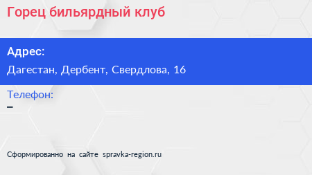Горец, бильярдный клуб по адресу Дагестан, Дербент, Свердлова, 16 в дальнейшем Организация, размещена в следующих категориях: