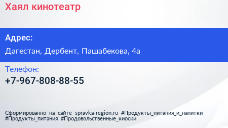Хаял, кинотеатр по адресу Дагестан, Дербент, Пашабекова, 4а в дальнейшем Организация, размещена в следующих категориях: