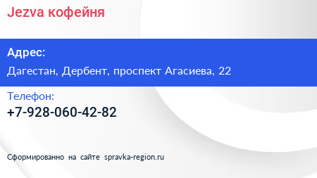Jezva, кофейня по адресу Дагестан, Дербент, проспект Агасиева, 22 в дальнейшем Организация, размещена в следующих категориях: