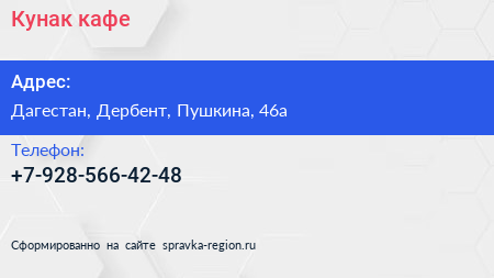 Кунак, кафе по адресу Дагестан, Дербент, Пушкина, 46а в дальнейшем Организация, размещена в следующих категориях:
