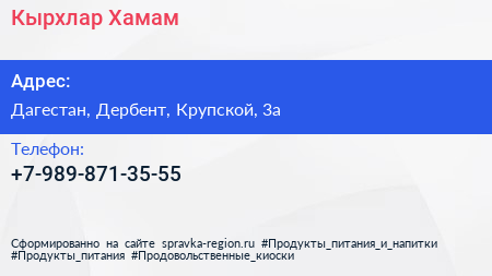 Кырхлар Хамам по адресу Дагестан, Дербент, Крупской, 3а в дальнейшем Организация, размещена в следующих категориях:
