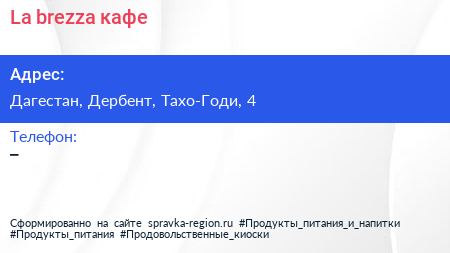 La brezza, кафе по адресу Дагестан, Дербент, Тахо-Годи, 4 в дальнейшем Организация, размещена в следующих категориях: