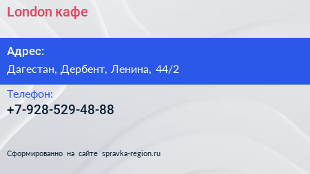 London, кафе по адресу Дагестан, Дербент, Ленина, 44/2 в дальнейшем Организация, размещена в следующих категориях: