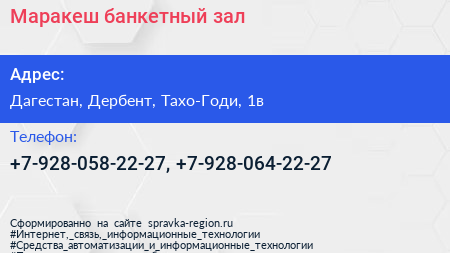 Маракеш, банкетный зал по адресу Дагестан, Дербент, Тахо-Годи, 1в в дальнейшем Организация, размещена в следующих категориях: