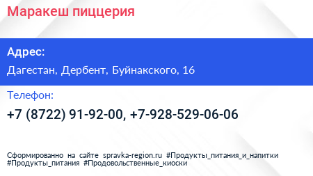 Маракеш, пиццерия по адресу Дагестан, Дербент, Буйнакского, 16 в дальнейшем Организация, размещена в следующих категориях:
