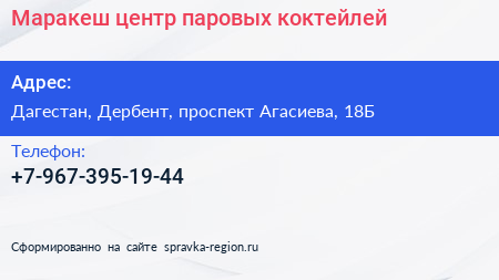 Маракеш, центр паровых коктейлей по адресу Дагестан, Дербент, проспект Агасиева, 18Б в дальнейшем Организация, размещена в следующих категориях: