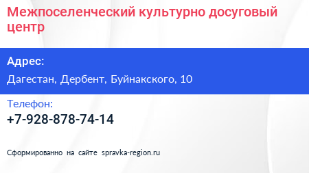 Межпоселенческий культурно-досуговый центр по адресу Дагестан, Дербент, Буйнакского, 10 в дальнейшем Организация, размещена в следующих категориях: