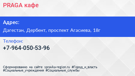 PRAGA, кафе по адресу Дагестан, Дербент, проспект Агасиева, 18г в дальнейшем Организация, размещена в следующих категориях: