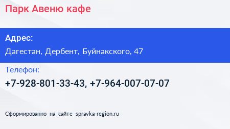 Парк Авеню, кафе по адресу Дагестан, Дербент, Буйнакского, 47 в дальнейшем Организация, размещена в следующих категориях: