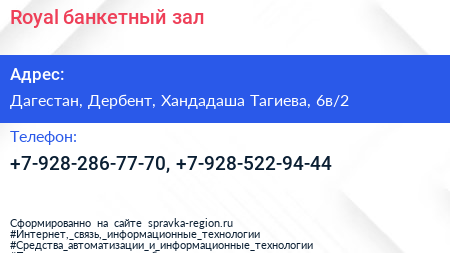 Royal, банкетный зал по адресу Дагестан, Дербент, Хандадаша Тагиева, 6в/2 в дальнейшем Организация, размещена в следующих категориях: