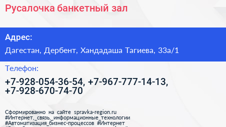 Русалочка, банкетный зал по адресу Дагестан, Дербент, Хандадаша Тагиева, 33а/1 в дальнейшем Организация, размещена в следующих категориях: