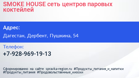 SMOKE HOUSE, сеть центров паровых коктейлей по адресу Дагестан, Дербент, Пушкина, 54 в дальнейшем Организация, размещена в следующих категориях: