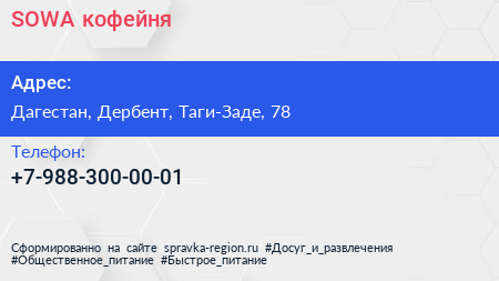 SOWA, кофейня по адресу Дагестан, Дербент, Таги-Заде, 78 в дальнейшем Организация, размещена в следующих категориях: