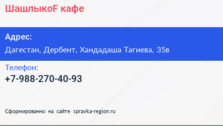 ШашлыкоF, кафе по адресу Дагестан, Дербент, Хандадаша Тагиева, 35в в дальнейшем Организация, размещена в следующих категориях: