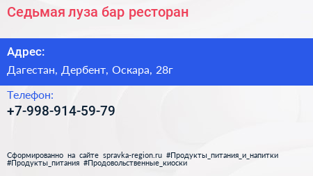 Седьмая луза, бар-ресторан по адресу Дагестан, Дербент, Оскара, 28г в дальнейшем Организация, размещена в следующих категориях: