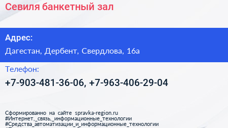 Севиля, банкетный зал по адресу Дагестан, Дербент, Свердлова, 16а в дальнейшем Организация, размещена в следующих категориях: