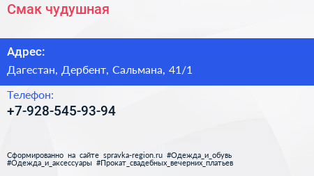 Смак, чудушная по адресу Дагестан, Дербент, Сальмана, 41/1 в дальнейшем Организация, размещена в следующих категориях:
